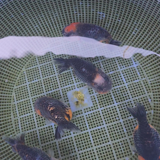 Assorted Kirin Ranchu goldfish, approximately 3.5 inches in size. Each fish is randomly selected from our current stock, so the individual you receive may differ from photos and videos displayed. These distinctive Kirin-patterned ranchus feature the breed's characteristic rounded body shape and flowing fins. Perfect for established aquariums or pond systems. Please note that specific coloration and pattern variations are not guaranteed to match product imagery.